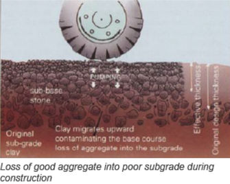 Salah satu solusi untuk masalah ini adalah penggunaan Geotekstil yang sesuai yang ditempatkan pada batas antara tanah dasar lunak dan agregat sub-base. Jika dirancang dengan benar, Geotekstil menyediakan cara yang paling hemat biaya untuk menstabilkan lapisan awal timbunan yang ditempatkan di atas tanah dasar lunak.